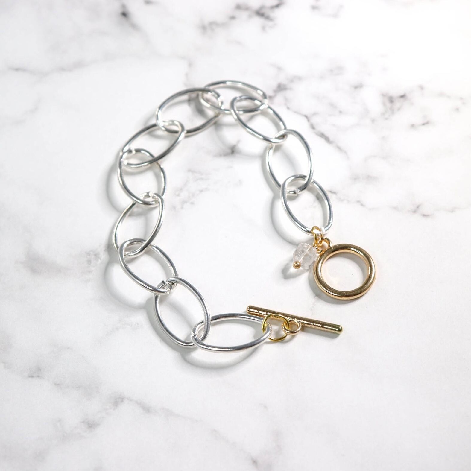 シルバーの大ぶりなリングが手元に存在感を与えるブレスレット。