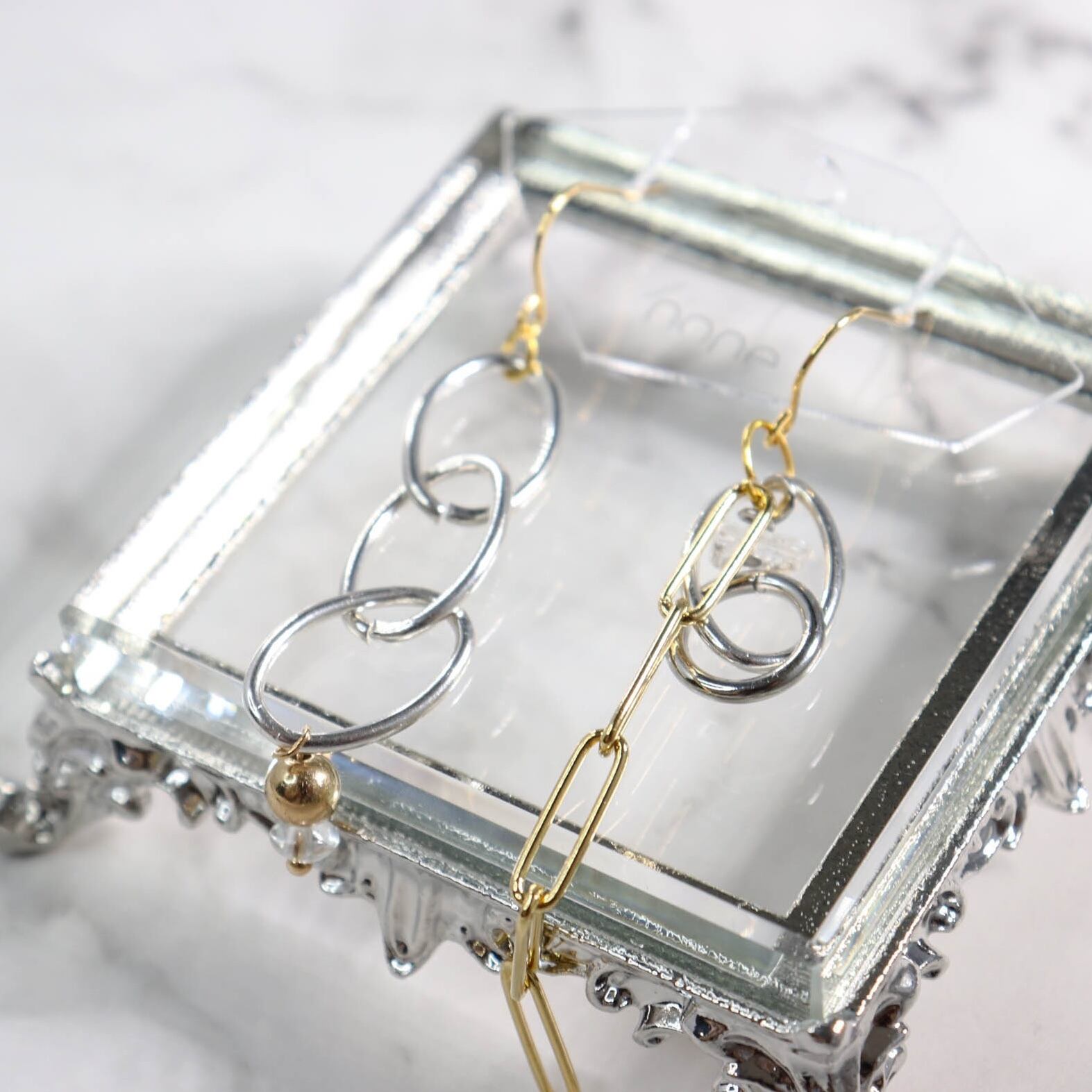 片耳には、太陽の光を編んだような、ゴールドのしなやかなチェーン。